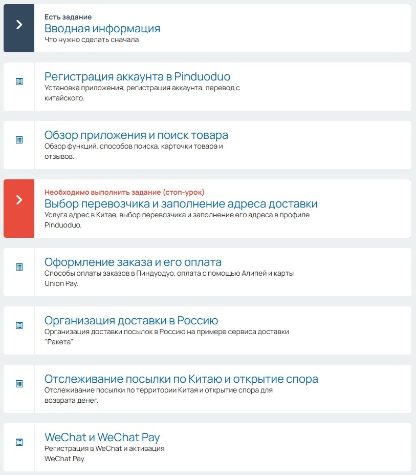 Кроме того, в курсе содержатся отдельные уроки по Алипей и Вичат пей, инструкции по работе с перевозчиками (прямой доставки в Россию у маркетплейса нет).